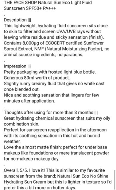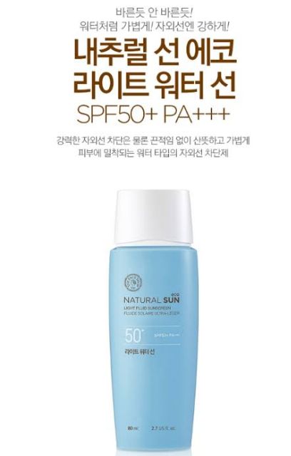 THE FACE SHOP Natural Sun Eco Light Fluid Sunscreen SPF50 PA 80ml 2439 Lightweight moisturising and quick absorbing without leaving skin sticky or white cast. See full analysis here. PROTECTS SKIN BETTER AND LESS OILINESS MAKING IT USABLE EVERY DAY.